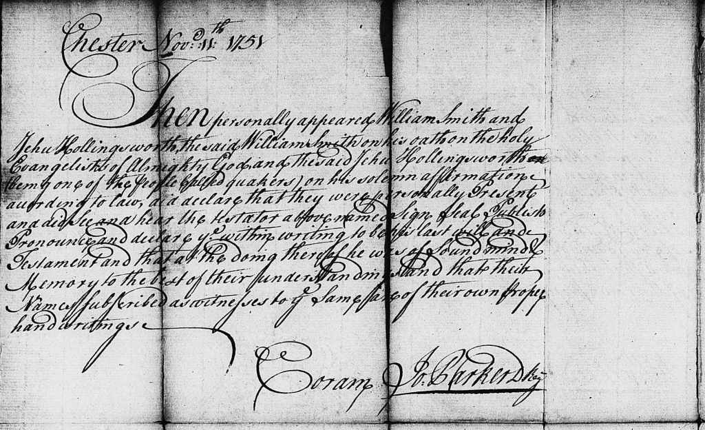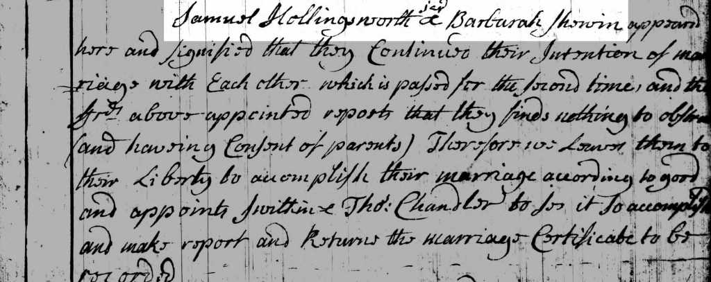 [5] Kennett Monthly Friends Meeting, Chester County, Pennsylvania: Women´s Minutes, 1690-1789; digitized at Ancestry in the collection U.S., Quaker Meeting Records, 1681-1935. See John Pitts Launey, First Families of Chester County, Pennsylvania, vol. 2 (Westminster, Maryland: Heritage, 2000), p. 83, noting that the application of the couple for permission of their Friends meeting to marry on 13th of 9th month 1738 shows Samuel Hollingsworth “of Birmingham.”