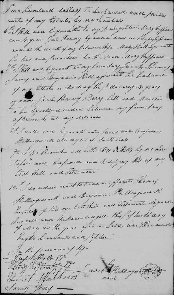 7th I will and bequeath to my four Sons Jacob[,] Thomas[,] James[,] and Benjamin Hollingsworth the balance of my Estate including the following Negroes by name Jack[,] Harvey[,] Harry[,] Lett[,] and Marien to be Equally divided between my four Sons aforesaid at my desease