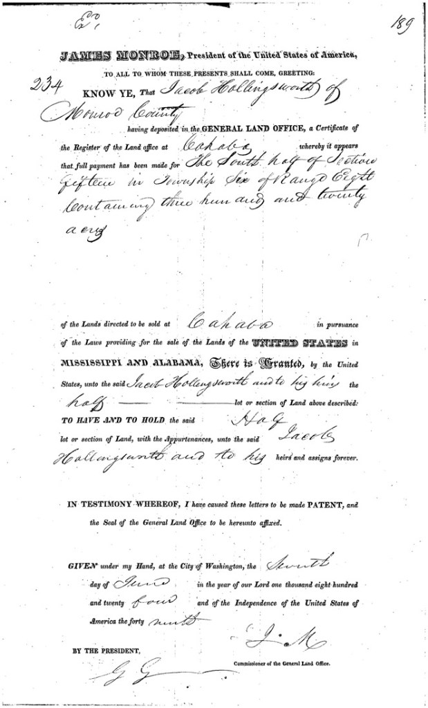 In the absence of land records in Monroe County up to 1833, it’s not easy to document Jacob Hollingsworth’s activities in this county from the time he moved there until he made his final move to Caddo Parish, Louisiana, in 1839 or 1840. Federal land records do, however, indicate that he was an active buyer of tracts of federal land in that county from 7 June 1824, when he acquired his first piece of federal land there, into the 1830s. His first patent on 7 June 1824 at the Old Cahaba land office was for 320 acres in Monroe County, and it shows him residing in that county when he purchased the land.[15] From June 1824 up to 18 August 1837, when he made his last federal land purchase in the county, Jacob filed five more patents in Monroe County. By August 1837, he had acquired 640.15 acres of federal land in the county.