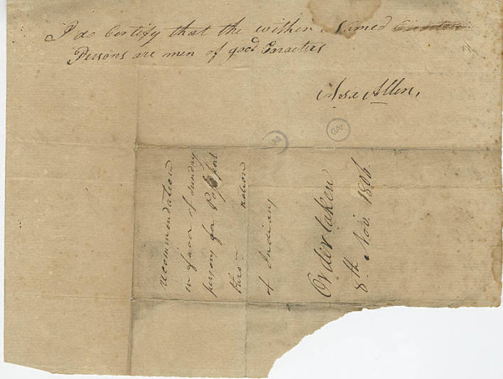 A decade before he moved his family to Monroe County, Alabama, Jacob appears in a record of a group of men going from Franklin County, Georgia, into the Creek Nation. On 26 October 1806, Jeptha Harrington of Franklin County applied to the governor of Georgia for a passport for himself, Jacob Hollingsworth, and James, Alexander, and John Martin to pass through the Creek Nation to Natchez Territory or surrounding country.[11] The passport application contains a note of recommendation by Colonel Asa Allen, who represented Franklin County multiple times in the Georgia legislature, stating that he knew the five men requesting the passport and they were of good repute, and a notation that the order was taken on 8 November 1806. (See the head of this posting for the first page of this passport document.)