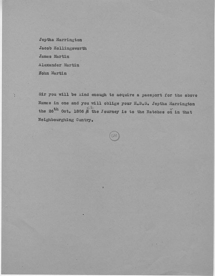 [11] This document is held by Georgia Archives, and is available in digital form at the Virtual Vault of the Archives online. This passport is transcribed in Mary G. Bryan, Passports Issued by Governors of Georgia, 1785-1809 (Washington, D.C.: National Genealogical Society, 1959), pp. 17-8.