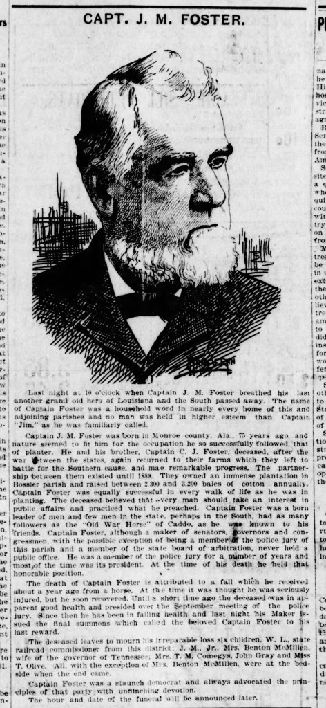 Biographies of Jacob’s descendants in Caddo and nearby parishes also speak of the family’s large landholdings and lucrative plantations in northwest Louisiana. For instance, the previously cited biography of Jacob’s grandson Claiborne Jasper Foster, son of Flavel Foster and Mary Hollingsworth, says that C.J. Foster and his brother James owned an “immense plantation” in Bossier Parish (and see his obituary in Shreveport Times on the same point) and by 1890, when the biography was written, he owned 5,000 acres in areas around Shreveport and had “met with more than the average degree of success in pursuing [a planter’s calling].”[22] (See this previous posting for a digital image of the biography.) Alcée Fortier’s 1914 biography of Claiborne Jasper Foster’s brother James Martin Foster states that James was “one of the largest and most successful cotton planters in the state of Louisiana.”[23]