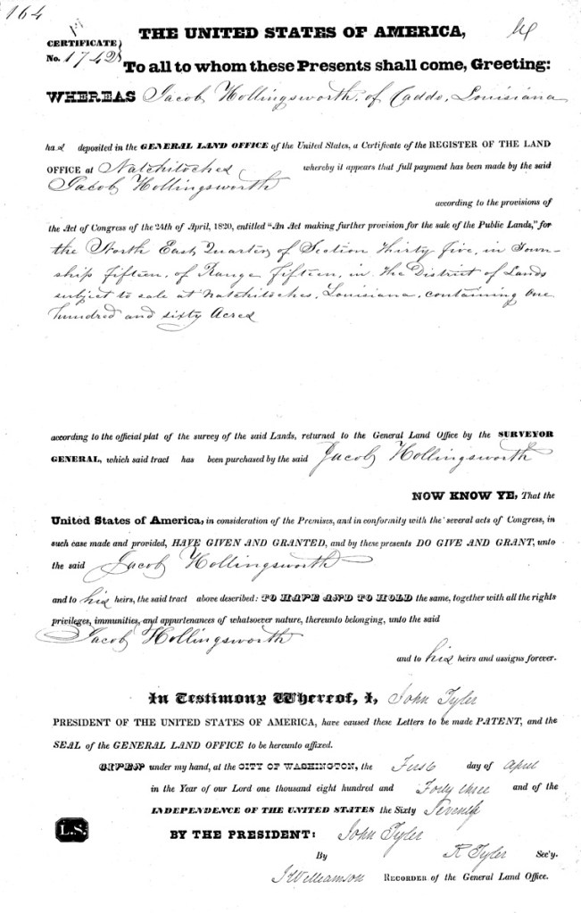 Caddo Parish conveyance records show a number of land transactions involving Jacob in that parish in the 1840s. On 6 July 1843, Jacob Hollingsworth sold his son-in-law Flavel Foster, both living in Caddo Parish, for $1,650 the south ½ of the west ½ of the southeast ¼ and the ? (a fold in the conveyance book on the microfilmed record obscures this information) ½ of the east ½ of the northeast ¼ of section 12. township 14 north, range16 west, 81 acres, , and the east ½ of the northwest ¼ and the east ½ of the southwest ¼ of section 12, township 14, range 16 west, 162 acres (Caddo Parish, Louisiana, Conveyance Bk. C, p. 114). The conveyance record states that both tracts had been warranted to William Crosby (Jacob’s son-in-law) at the federal land office in Natchitoches. Flavel Foster proved the conveyance on 12 July 1843 in Shreveport. The digital copy of this record at FamilySearch (available only at a computer in a library within the the Family History Library system) is very faint and hard to read.