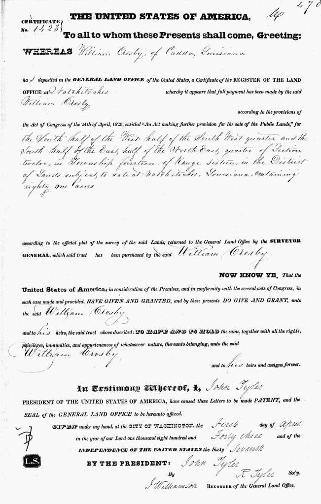 William Crosby had obtained both tracts from the federal land office at Natchitoches (certificates 1146 and 1423) on 1 April 1843, I haven’t found a record showing how his father-in-law Jacob Hollingsworth acquired these pieces of land from Crosby.