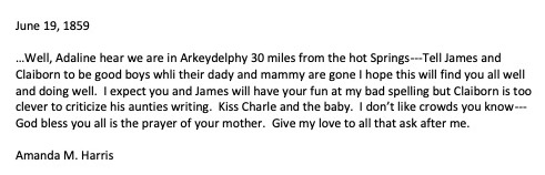 At her McGuir-1 family tree at Ancestry, Ancestry user Msmtmactx has shared the photograph of Amanda found at the head of this posting, as well as the three transcribed letters above. The 20 June 1856 letter was from Amanda to her daughter Adeline Foster Fullilove; speaks of her recent travels in Alabama, where she had visited friends in Mobile and had then seen “Mother” and “Father” — evidently the parents of her husband Charles Harris, since her own parents had died in Louisiana some years prior to 1856. The 14 August 1856 letter went from Amanda to her granddaughter Evelyn Fullilove; it speaks of a trip to a place called “Wilform Springs,” which I haven’t been able to identify. The last letter, which Amanda wrote on 19 June 1859, was sent to Adeline, and indicates that Amanda was at Arkadelphia, Arkansas, headed to Hot Springs, probably to take the waters. Each of the three letters alludes to her ill health, which would explain her going to Hot Springs and “Wilform Springs.”