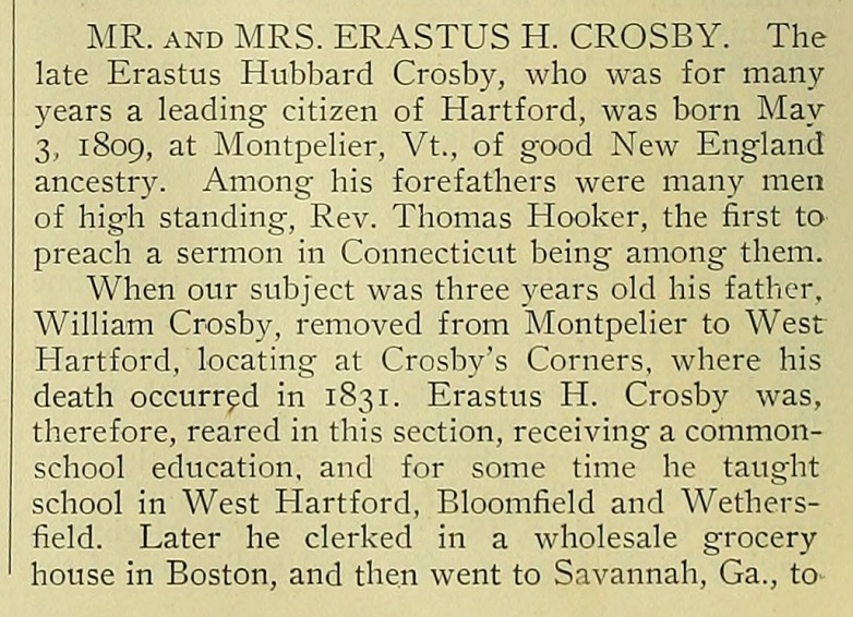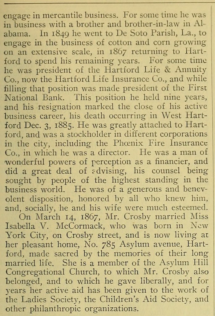 A biography of Erastus in Commemorative Biographical Record of Hartford County, Connecticut has a picture of him with biographical information.[10] This states that after teaching school in Connecticut and clerking in a store in Boston, he went to Savannah, Georgia, to engage in the mercantile business. He was then in business in Alabama for a period of time with his brother William Crosby and with a brother-in-law (perhaps Samuel Hollingsworth, though this is not stated), and in 1849 he went to DeSoto Parish, Louisiana, where he engaged “in the business of cotton and corn growing on an extensive scale.” In 1867 he returned to Connecticut where he was president of Hartford Life & Annuity Company.