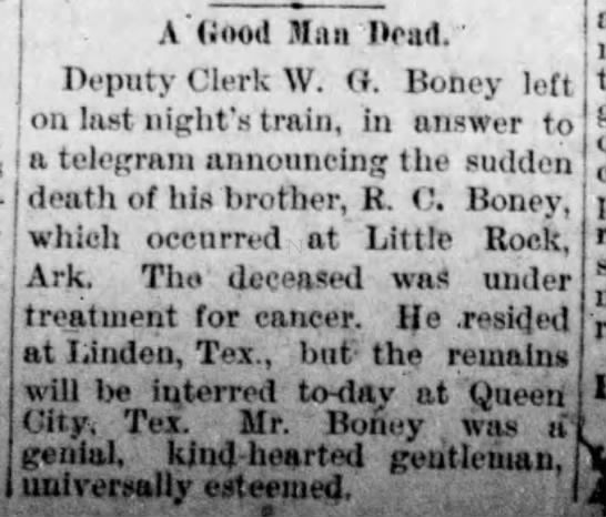 An obituary notice of Richard Collins Boney in Shreveport Times says that he died at Little Rock while being treated for cancer, and his body was then taken to Queen City, Texas, for burial.[16] He was living at Linden, Cass County, Texas, when he died.