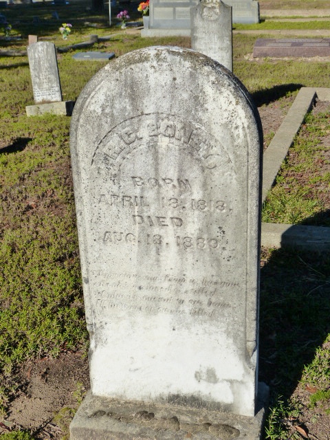 10. Helen M. Hollingsworth was born 6 December 1827 in Monroe County, Alabama, and died 24 August 1848 at Blossom Hill, Caddo Parish, Louisiana. On 11 January 1844 in Caddo Parish, she married Richard Collins Boney, son of Wimberk Boney and Nancy Collins. Richard was born 18 April 1818 in Duplin County, North Carolina, and died 18 August 1889 at Little Rock, Pulaski County, Arkansas. Helen is buried in the Hollingsworth cemetery at Preston, Caddo Parish, Louisiana, and Richard in Queen City cemetery, Queen City, Cass County, Texas.[15] Richard C. Boney was a brother of Kittie Jane Boney who married Helen Hollingsworth’s brother Jacob James Hollingsworth.