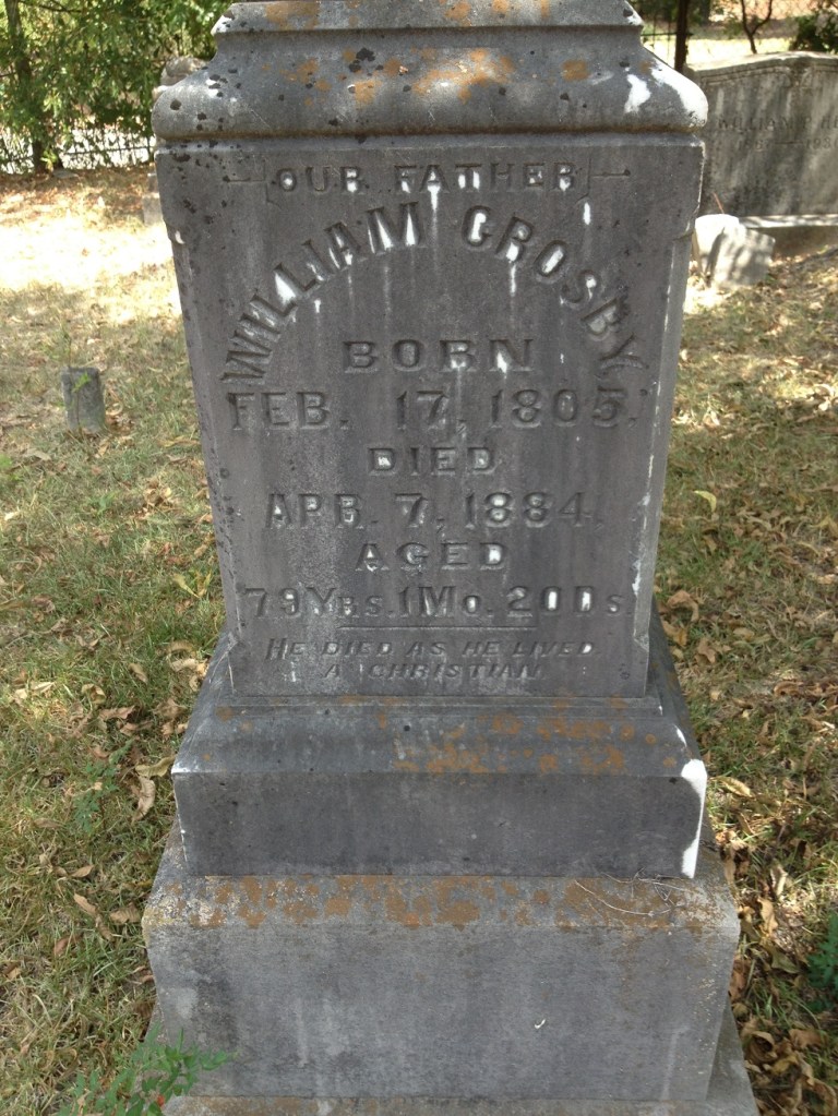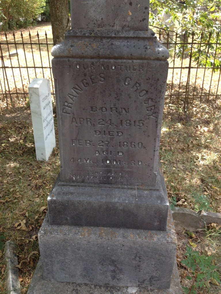 6. Frances Hollingsworth was born 24 April 1816 in Franklin County, Georgia, and died 27 September 1860 in DeSoto Parish, Louisiana. On 17 January 1834 in Monroe County, Alabama, Frances married William Crosby, son of William Crosby and Rachel Hubbard. William Crosby Jr. was born 17 February 1805 at Hartford, Hartford County, Connecticut, and died 7 April 1884 in DeSoto Parish, Louisiana. Frances Hollingsworth and husband William Crosby are buried in Manfield cemetery at Mansfield, DeSoto Parish, Louisiana, with tombstones dating their dates of birth and death.[7] A memorial tribute to William Crosby in Shreveport Times on 15 May 1884 also states his date of death.[8]