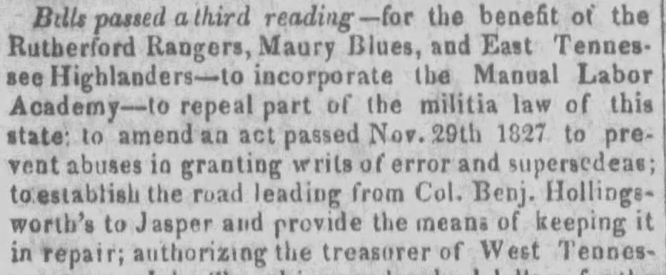 Benjamin Hollingsworth’s name appears (as Col. Benjamin Hollinsworth) in a Tennessee state act in 1829 to establish a road leading from his house in Franklin County to Jasper in Marion County.[41] Marion County is contiguous to Grundy into which Benjamin and James Hollingsworth’s Franklin County land eventually fell.