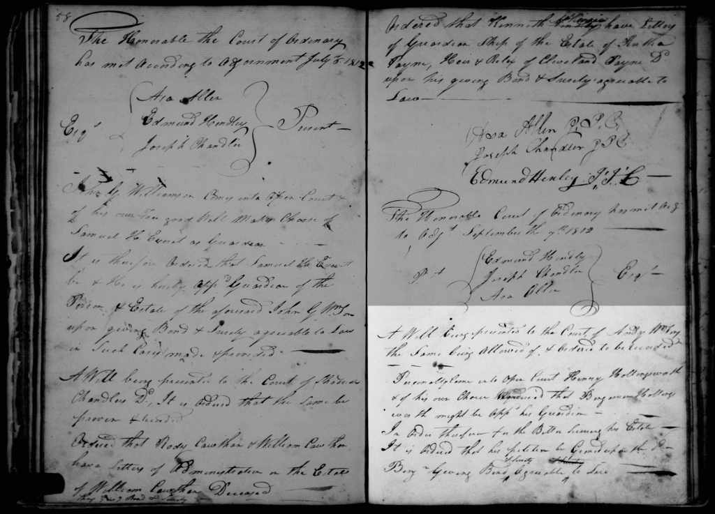 Sadie Greening Sparks’s notes state that at the county court of ordinary’s September 1814 session, Benjamin Hollingsworth presented receipts for his guardianship of his nephew to the court.[16] I do not find this record in the county court of ordinary minutes for the September 1814 court session.