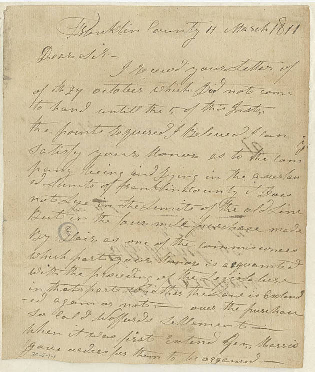 Therefore I hope your Honor will not permit your frontier go on gaurded [sic: “unguarded”] as about forty men would gaurd [sic] the frontears [sic] of Franklin County placed in four different Stations which would Keep the savage foe in Dread and Secure your umble [sic] Subjects Lives and property from perilious [sic] Danger.