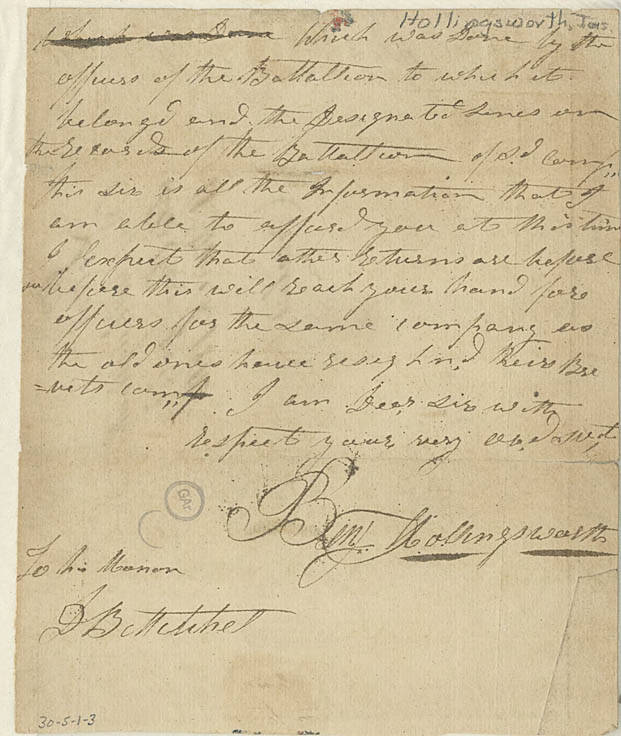 His reply suggests that Mitchell had written Hollingsworth to inquire whether Franklin County militia members had been engaged in operations beyond the boundary lines of the county — specifically, in the Cherokee Nation. Benjamin Hollingsworth assures the governor that military operations had remained within the county boundaries. The letter also notes as it ends that officers of the local militia company had been resigning, and Governor Mitchell would no doubt get word of this.