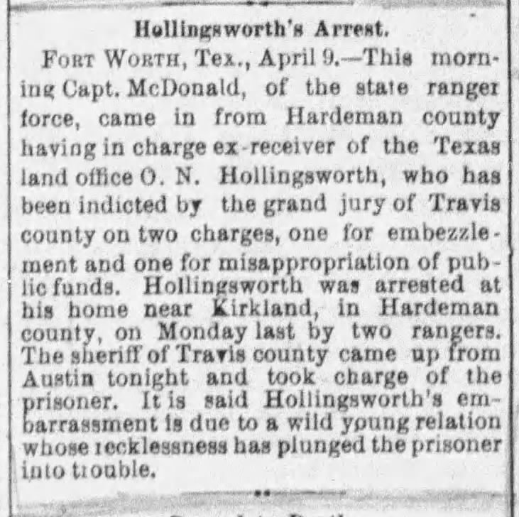 The Dallas city directory for 1893 suggests that in that year, Orlando and wife Ruth (née Ruth Grace Katherine Platner) were living separate from each othe — one suspects because Orlando was on the lam.[6] The city directory lists Ruth G.K. Hollingsworth (Mrs. O.N) on the fourth floor of the Middleton Building, over 395 Main, with her sons Orlando Jr. and Seth living with her, but no mention of her husband Orlando Sr.