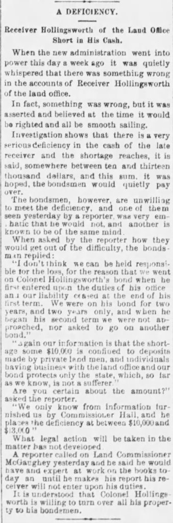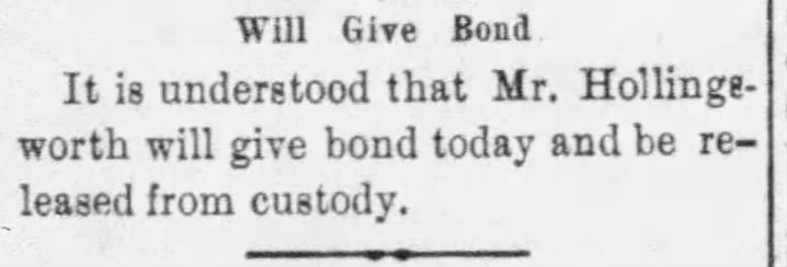 The other two lawmen then arrived and Mrs. Hollingsworth made beds for the three lawmen and they spent the night, taking Hollingsworth away the next morning. Evidently, he had stolen or embezzled money from the state due to the “high-living” habits of his children, which had ruined him financially.