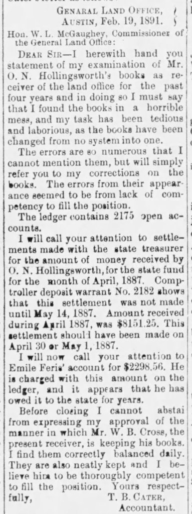 Sullivan says that the old gentleman O.N. Hollingsworth whom he arrested was highly educated, had an office in Austin, had been a teacher, and was about 65 years old in 1891. Though that age would make the O.N. Hollingsworth of Sullivan’s record ten years older than Orlando Newton Hollingsworth was, I’m quite sure the O.N. Hollingsworth about whom Sullivan is reporting was Orlando Newton Hollingsworth. This account explains why it appears he just vanished at the end of his life and there is not a clear date and place of death for him. He had skipped bail after being arrested in Texas, as census data show us, he hied himself away to Atlanta and lived the final years of his life there, dying under a cloud so that there are no obituaries — that I can find — in either Atlanta or Texas.