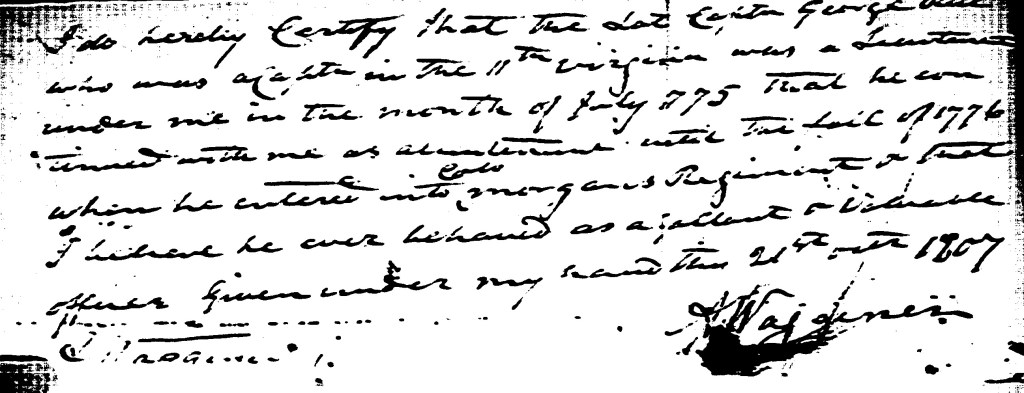 As my previous posting indicated, extensive documentation of George Rice’s Revolutionary service is found in both his service papers held by the National Archives and in his Revolutionary bounty land claims files held by the Library of Virginia.[20] From these sets of valuable documents, we learn that George Rice began his Revolutionary service in June or July 1775 as a lieutenant under Captain John Neville and First Lieutenant Andrew Waggoner, after which he became a captain in the 11th Virginia regiment under Colonel Daniel Morgan on 10 March 1777.[21]