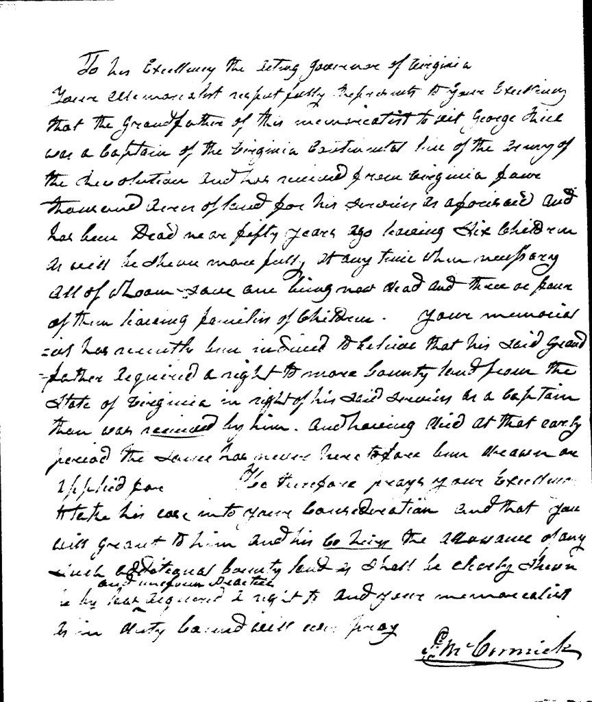 George Rice’s rejected bounty land claims file contains an undated letter written by his grandson John McCormick to the governor of Virginia as George’s heirs filed for additional bounty land in 1841. This document (the original of which is in the Washington Papers) states that George had been awarded 4,000 acres for his service as a captain in the Virginia line, but thought he was owed more bounty land. This claim, which his heirs advanced on behalf of his estate in 1841, was rejected.