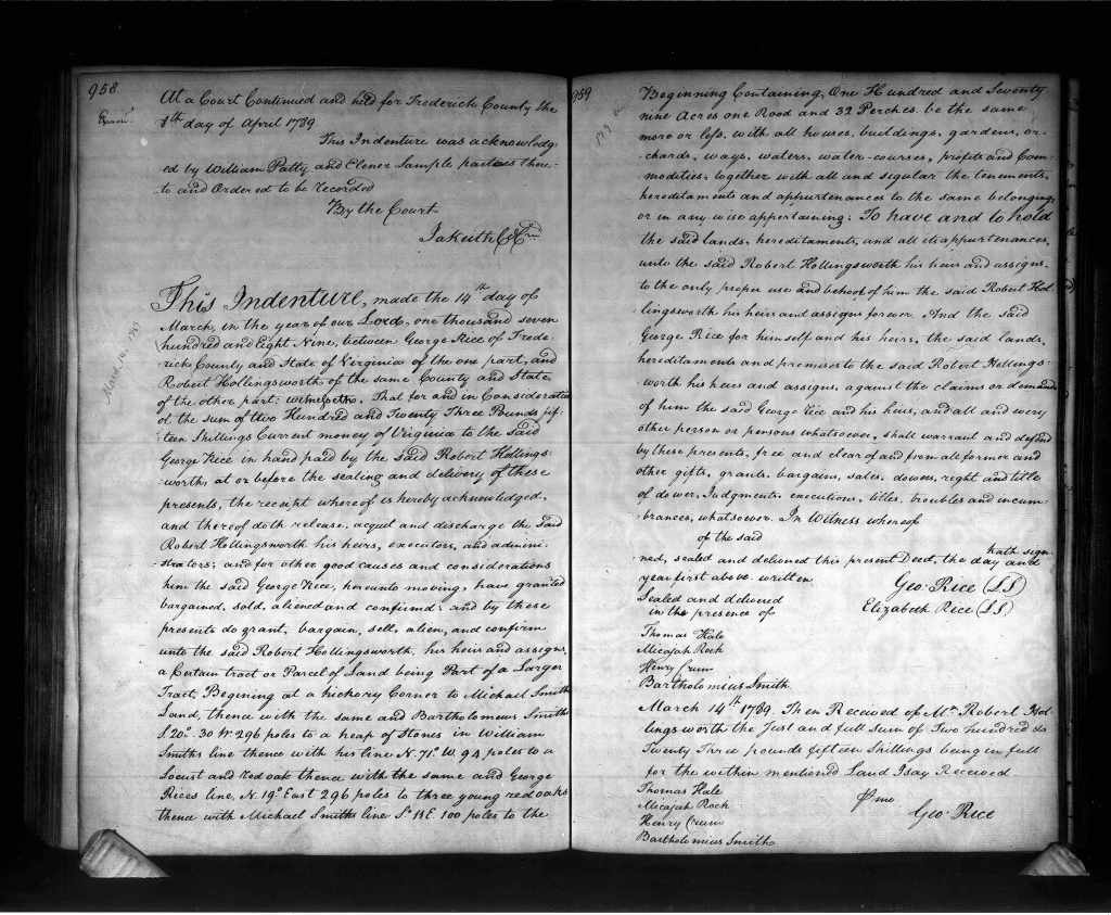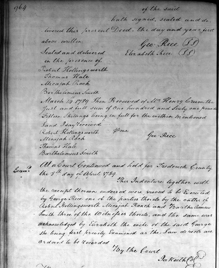As noted in a previous posting, on 14 March 1789, George and Elizabeth Rice made two deeds, first selling Robert Hollingsworth 179 acres in Frederick County with Thomas Hale, Micajah Roach, Henry Crum, and Bartholomew Smith witnessing, then selling Bartholomew Smith 6½ acres with Robert Hollingsworth, Thomas Hale, Micajah Roach, and Henry Crum witnessing.[41] Once again: Micajah Roach was a son-in-law George and Elizabeth’s son-in-law, husband of their daughter Ruth. As a previous posting shows, Robert Hollingsworth was George Rice’s brother-in-law, husband of George’s sister Susanna. He was a second cousin of Jacob Hollingsworth, who married Elizabeth Brooks Rice’s sister Mary.