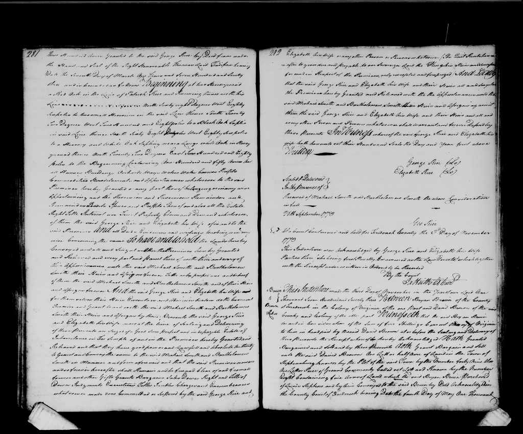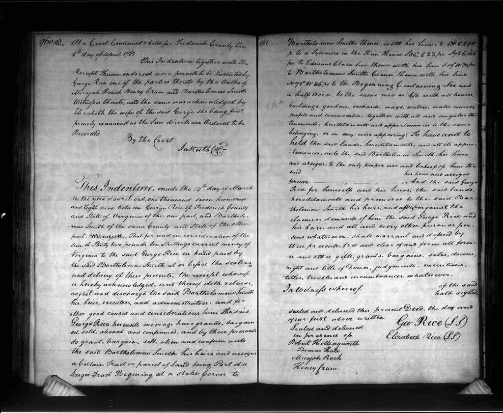 On 27 September 1773, George Rice (with wife Elizabeth) then sold more land to Michael and Bartholomew Smith — 150 acres out of the 300 acres granted to George Rice by Lord Fairfax on 7 March 1763.[17] George signed this deed with no witnesses, and it was recorded 3 November 1764, with Elizabeth relinquishing her dower right on the same day.