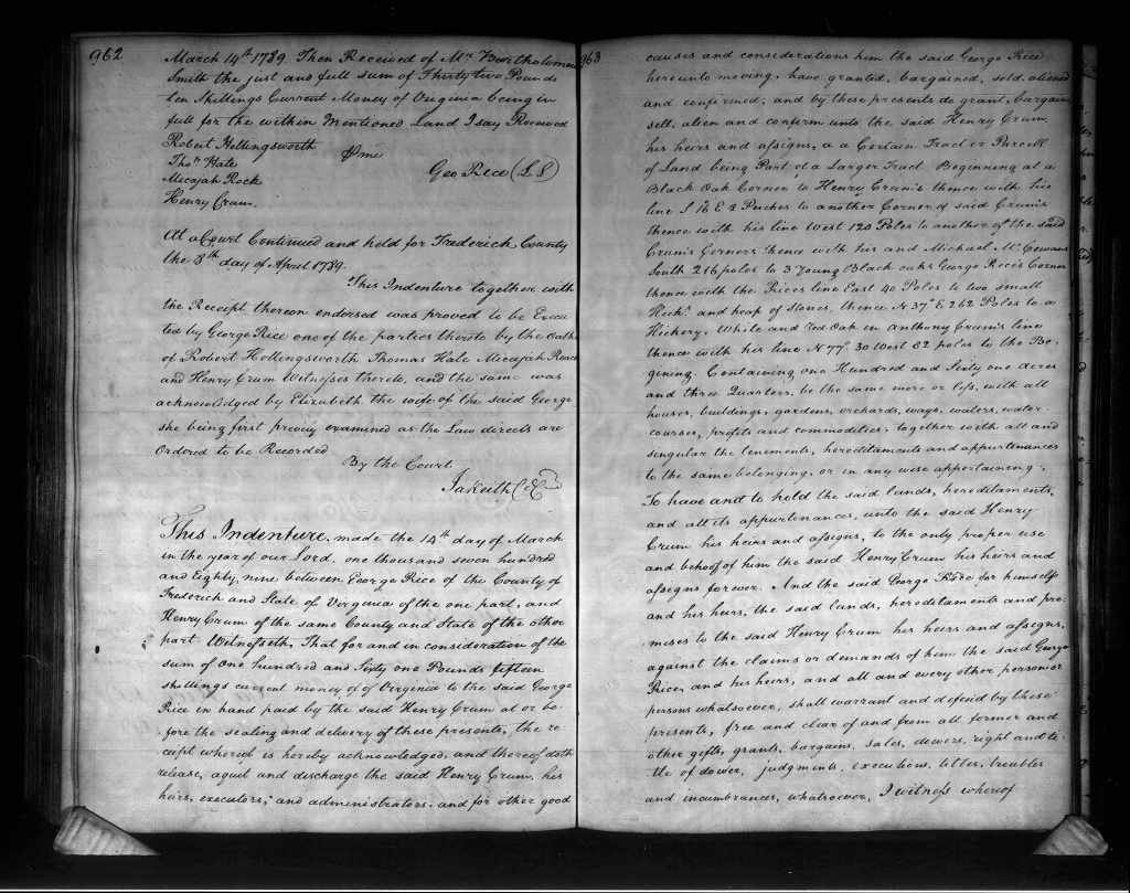 On the same day (i.e., 14 March 1789), George and Elizabeth Rice sold Henry Crum 161¾ acres in Frederick County adjoining Henry’s own land, George Rice, and Anthony Crum. Witnesses to this deed were Robert Hollingsworth, Thomas Hale, Micajah Roach, and Bartholomew Smith.[42] As I noted previously in discussing this deed, it seems to me that George and Elizabeth were selling pieces of their Frederick County land at this time as they made plans to move to Woodford County, Kentucky, following the death of Elizabeth’s mother Mary Brooks in 1787.