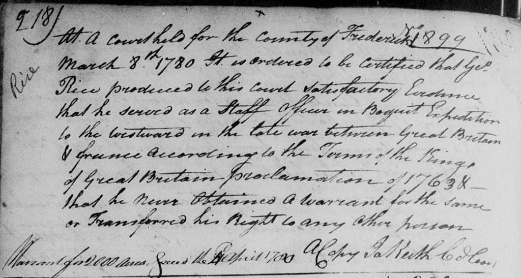 Those serving as captains in the French and Indian War were eligible (down the road) to claim 3,000 acres from the state of Virginia for their service.[7] After he made his affidavit in Frederick County court in March 1780, on 4 April 1780, George Rice received a warrant for 2,000 acres for this military service.[8] I have not found a land grant matching this warrant, and do not know if George sold it to someone else or claimed this land. As we’ll see, Virginia bounty land files for Revolutionary soldiers will also show him claiming land for his Revolutionary service.