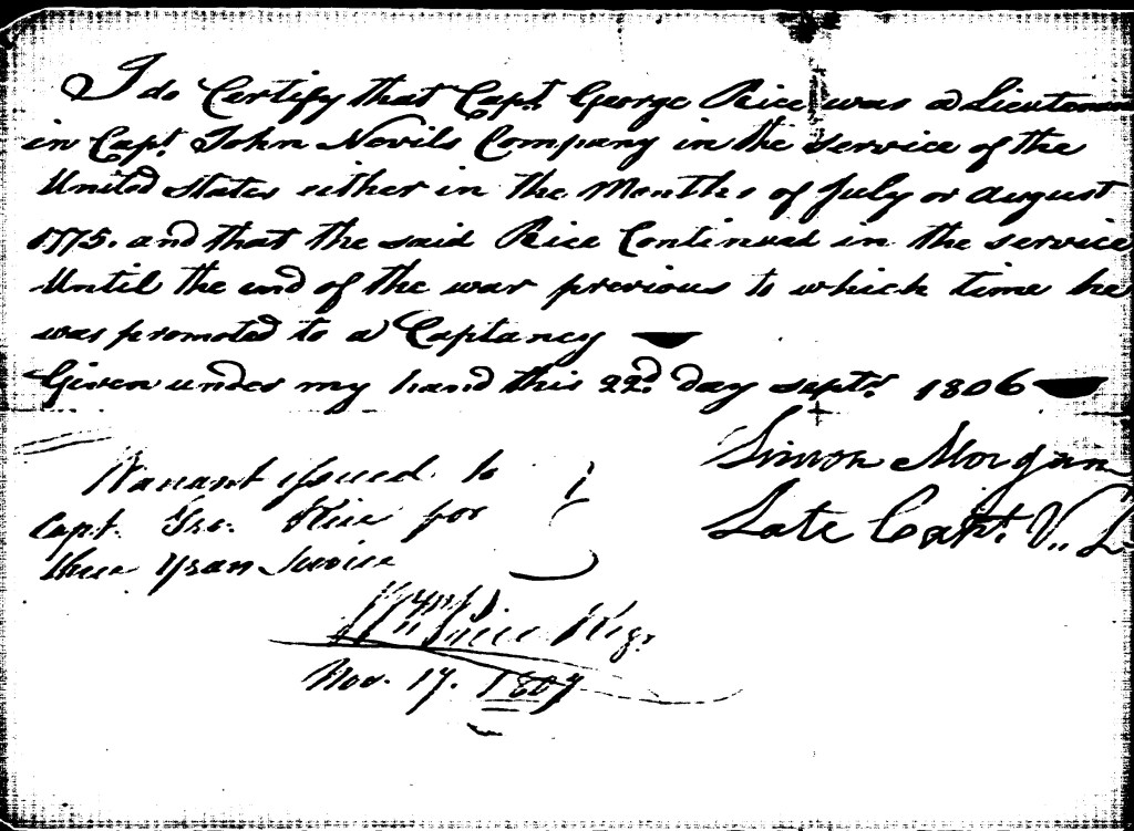 [21] See 22 September 1806 affidavit of Simon Morgan, 19 November 1807 affidavit of James Wood, and 21 October 1807 affidavit of Andrew Waggoner in George Rice’s bounty warrant files cited in n. 20, supra. See also U.S. Congress report on 1841 claim of heirs of George Rice, U.S. Congress, Reports of Committees, 16th Congress, 1st Session – 49th Congress, 1st Session, vol. 2, report 398 (Washington, D.C., 1842).