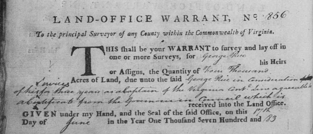 Virginia Revolutionary bounty land warrant files also have a warrant issued to George Rice on 1 August 1783, stating that he was a corporal of the Virginia line for three years and should be awarded a corporal’s portion of bounty land. Benjamin Harrison signed this warrant. I have found no documents showing that he was issued additional land due to this warrant, and it’s the only document I’ve found giving him the rank of corporal and not captain, other tha a notice in his bounty land claims file stating that he was issued a voucher in 1783 for service as a corporal.
