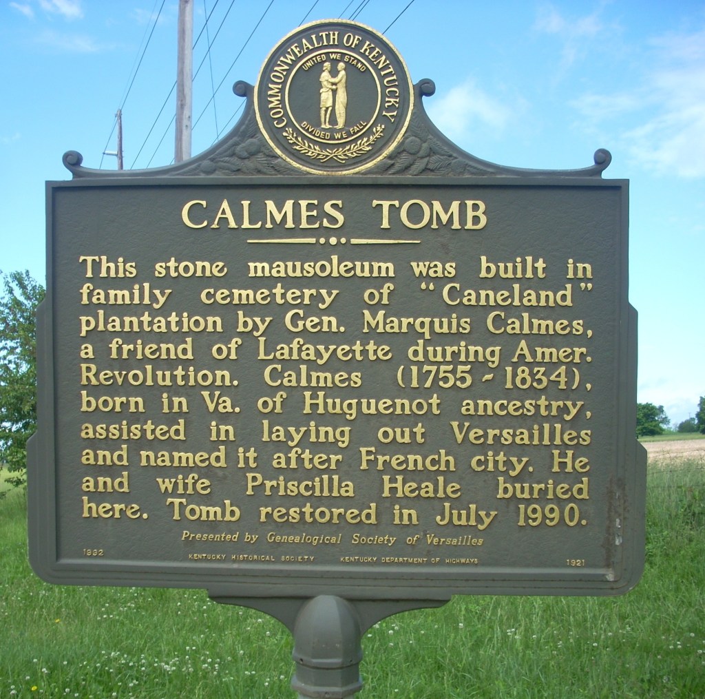 [5] William E. Railey, “Woodford County (Second Installment),” p. 77. See also John A. Steele, “General Marquis Calmes of ‘Caneland,’ A Revolutionary Hero of Woodford Co., Ky.,” pp. 49-51.