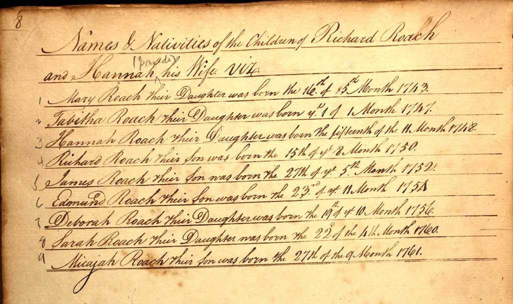 Ruth Rice and Micajah Roach received license to marry on 4 April 1786 in Frederick County, Maryland.[6] Regarding Micajah’s life prior to his marriage, there are some interesting documents. The register of births, marriages, and burials kept by Fairfax Friends Monthly Meeting in Loudoun County, Virginia, shows him born 27th 9th month 1761, the son of Richard Roach and Hannah Sands, members of the Fairfax Friends Meeting.[7]