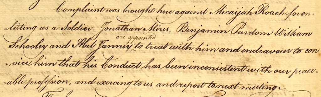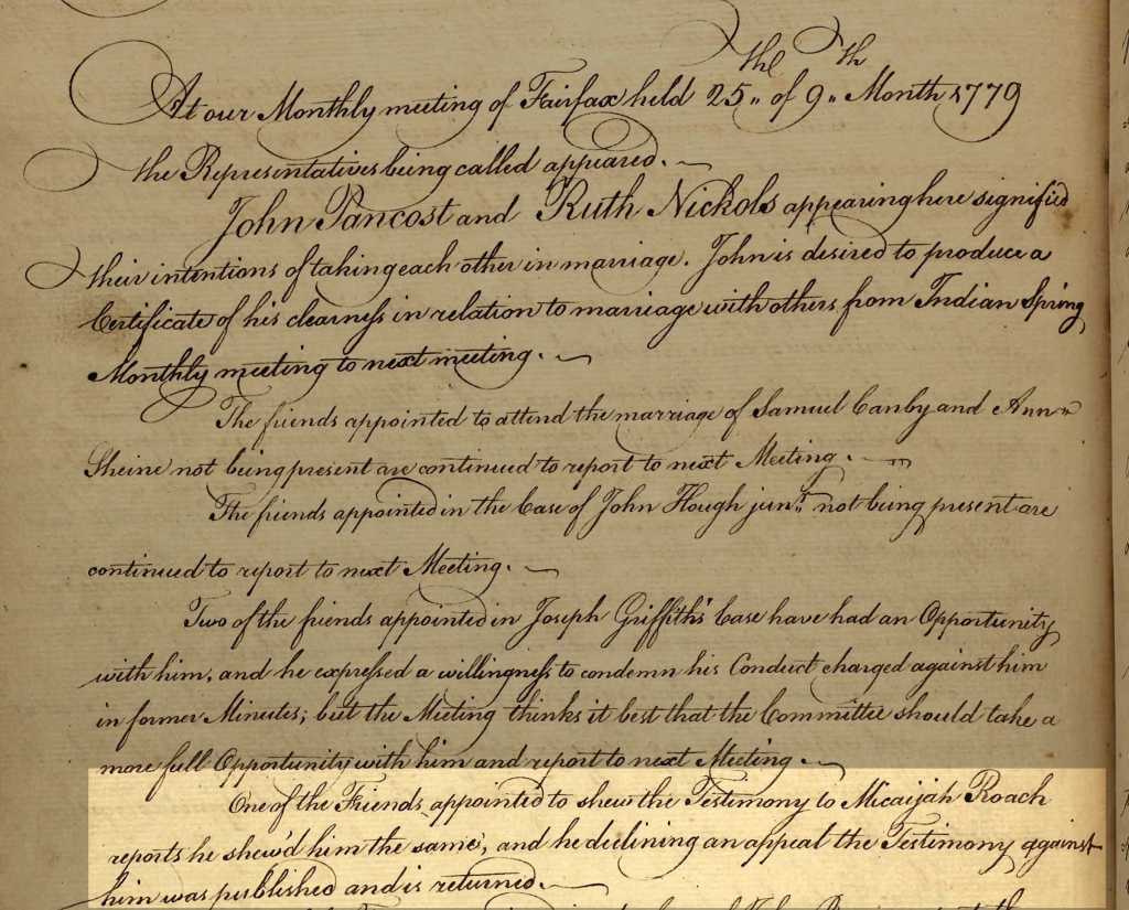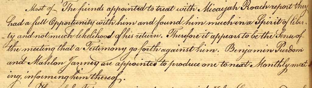 At the meeting held on 24th 7th month 1779, the Friends previously appointed to treat with Micajah Roach then reported to the meeting that they had found him “much in a spirit of liberty and not much likelihood of his return” to the Friends. The meeting then decided that testimony against Micajah should go forth, with Benjamin Purdom and Mahlon Janney appointed to produce this and report it to him.[10]