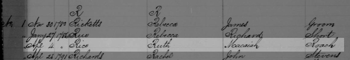 I am assuming that Ruth was the first child of George and Elizabeth Brooks Rice, since she’s first in the list of George and Elizabeth’s children provided by Bartholomew Smith in a 15 April 1808 complaint initiating a lawsuit Smith filed in Augusta chancery court against George Rice’s executors has the first three children listed in the same order as in Province McCormick’s list, but places Edmund between Mary and George and Rebecca after George.[5] As previous postings have noted, I think George Rice and Elizabeth Brooks married about 1767, and I’m basing that date in part on the documented date of birth of Ruth as their first child.