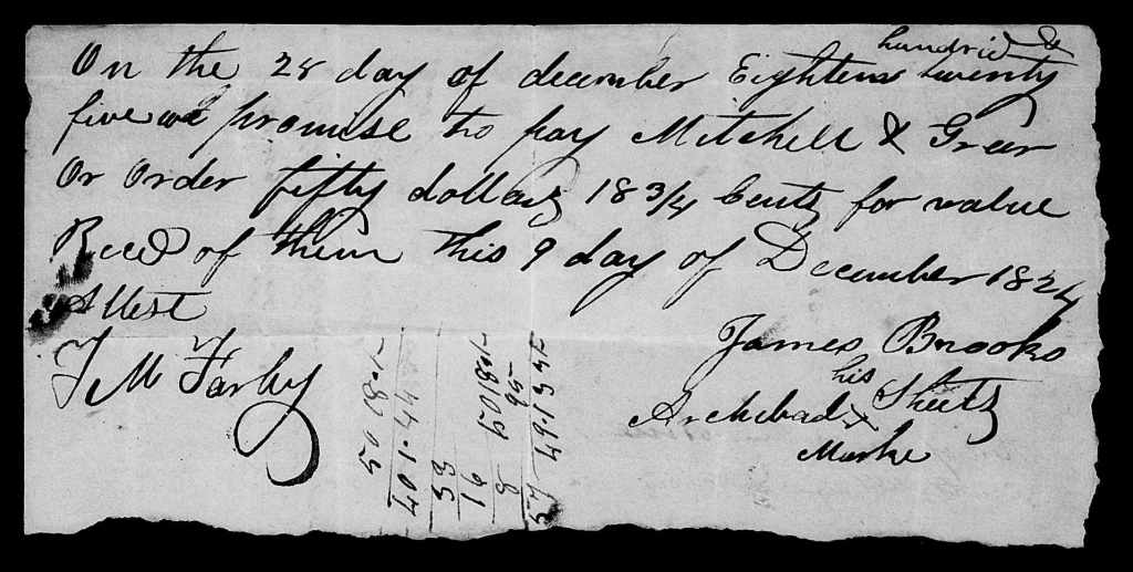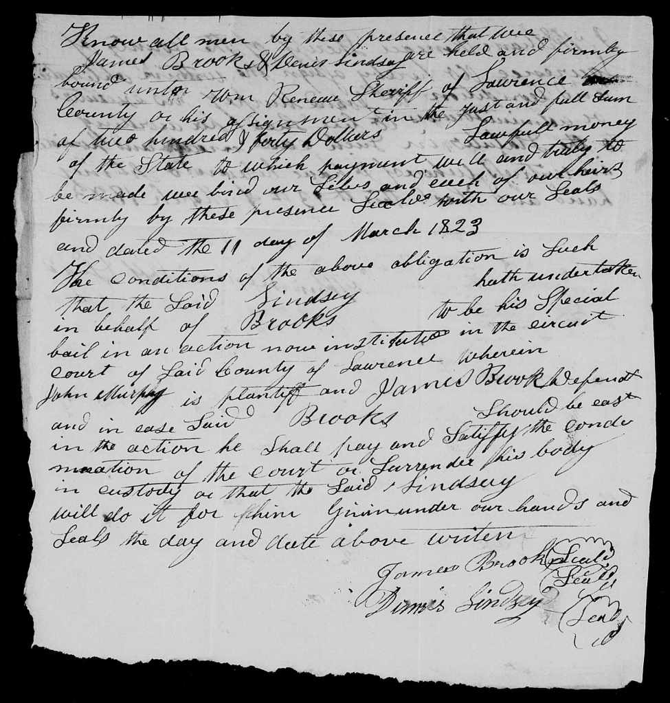 In January 1823, John Murphy sued James Brooks for debt in another case in Lawrence circuit court. The case file contains a promissory note that James Brooks had made on 5 January 1822 to James Forbes for $120. The note had then passed from Forbes to Murphy, who was suing James for that amount. In this case file is a bond James made on 11 March 1823 with Dennis Lindsey, husband of James’s niece Jane Brooks, which has the signatures of both James and Dennis.[29]