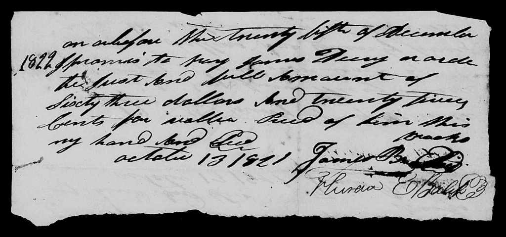 On 22 September 1823, James Dury filed suit in Lawrence County circuit court against James Brooks and Theron Balch regarding a promissory note the two had made to him on 13 October 1821. The case file for this lawsuit shows that Brooks and Balch satisfied the debt on or before 12 March 1824. The file contains the note Brooks and Balch made to Dury, as well as a bond the two signed with John Balch on 7 March 1823.[30]