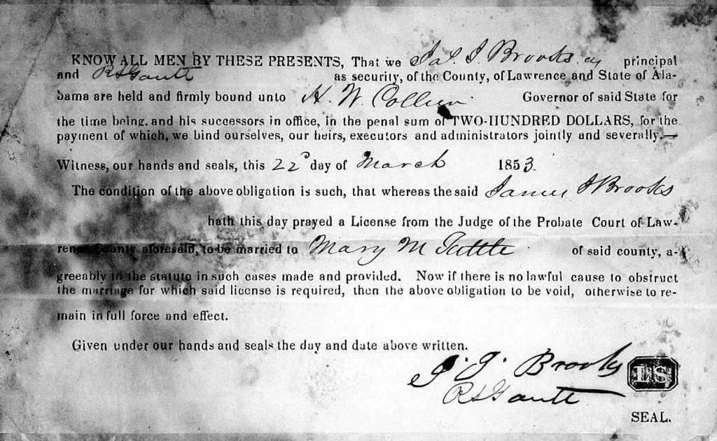 [3] See the original bond and license on file in loose-papers marriage files of Lawrence County, Alabama. The marriage is recorded in Lawrence County, Alabama, Marriage Bk. A, p. 152.
