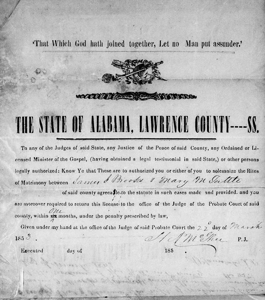 [2] The marriage license and return are in the original records marriage file in Lawrence County, Alabama; the marriage is also recorded in Lawrence County, Alabama, Marriage Bk. B, p. 256.