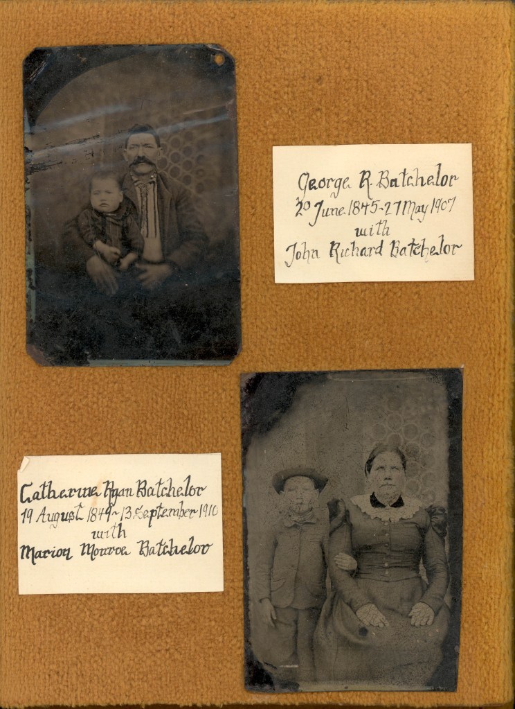 In previous years, I have gone through old family photos that have ended up in my possession, and have identified, scanned, catalogued them, and put them into albums. Before her death in 1968, my maternal grandmother Hattie Batchelor Simpson (1888-1968) gave me an album of tintype photos that her mother had given to her on her 12th birthday in 1900. That album has a number of photos of her parents George Richard Batchelor (1845-1907) and Catherine Ryan (1849-1910), as well as photos of a number of their children including my grandmother. I’ve added to it a small framed tintype photo of my great-grandfather Mannen Clements Simpson (1845-1886) that his granddaughter, my mother’s first cousin, gave me. (George was born 20 June 1845 in Hardin County, Tennessee, and died 17 May 1907 in Grant County, Arkansas. Catherine was born 19 August 1849 in Mullinavat, County Kilkenny, Ireland, and died 13 November 1910 in Grant County, Arkansas. Mannen was born 15 June 1845 in Tuscaloosa County, Alabama, and died 3 November 1886 in Calhoun County, Mississippi.)