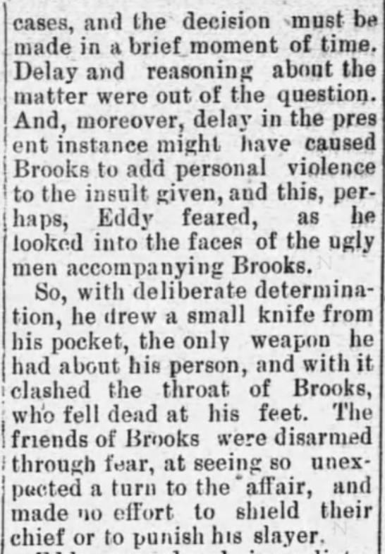 On a certain morning, Brooks plotted to insult Eddy. He arrived at the militia’s gathering place about 11 A.M. on the morning in question, accompanied by friends, and spat in Eddy’s face. Eddy then drew a small pocket knife and slashed Samuel F. Brooks’s throat, killing him instantly.