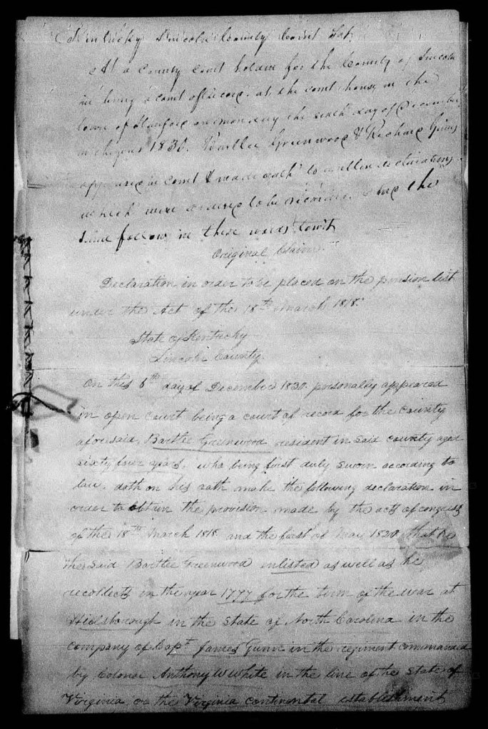 Another valuable piece of information that helps us estimate when William Greenwood was likely born, and which helps to confirm the “about 1772” birthdate, is found in the Revolutionary pension file of William’s older brother Bartlett/Bartlee Greenwood. Bartlee Greenwood’s Revolutionary pension file contains a transcript of the register of a bible belonging to Bartlee and his wife Nancy Sublett that Nancy submitted to Lincoln County, Kentucky, court on 22 January 1839 as proof for the pension application. Nancy’s affidavit states that the bible was so worn out and defaced that its the bible register could barely be read, but one of her sons had transcribed it.[8] It states that Bartlee Greenwood was born 18 July 1764.