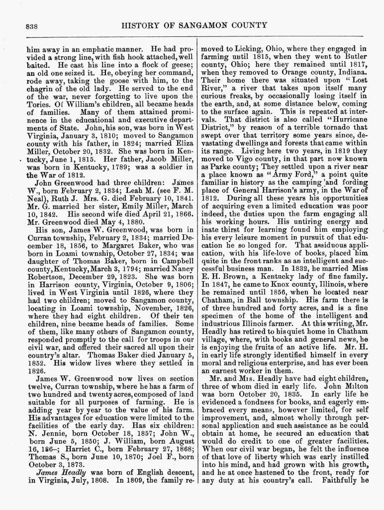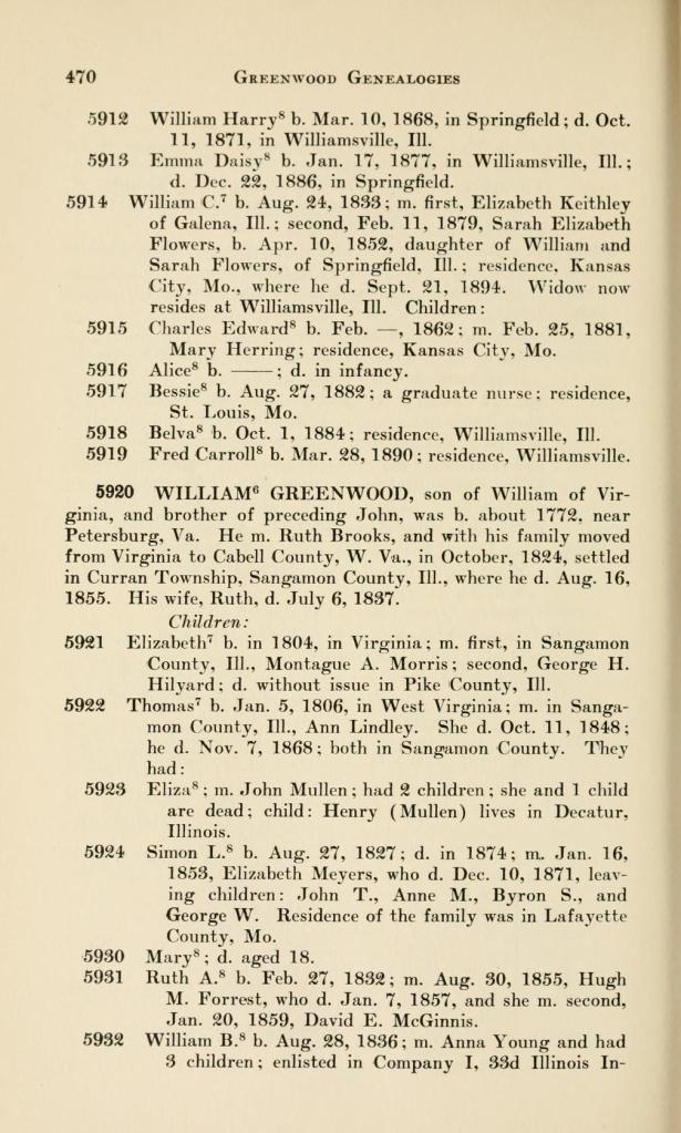 [7] Sangamon County, Illinois, Marriage Bk. 2, p. 103. Ruth Brooks Greenwood and William Greenwood’s dates of death are stated in Power, History of the Early Settlers of Sangamon County, Illinois, p. 338, and Greenwood, Greenwood Genealogies, 1154-1914, p. 470. History of Sangamon County, Illinois, p. 837, transposes Ruth and William’s dates of death.