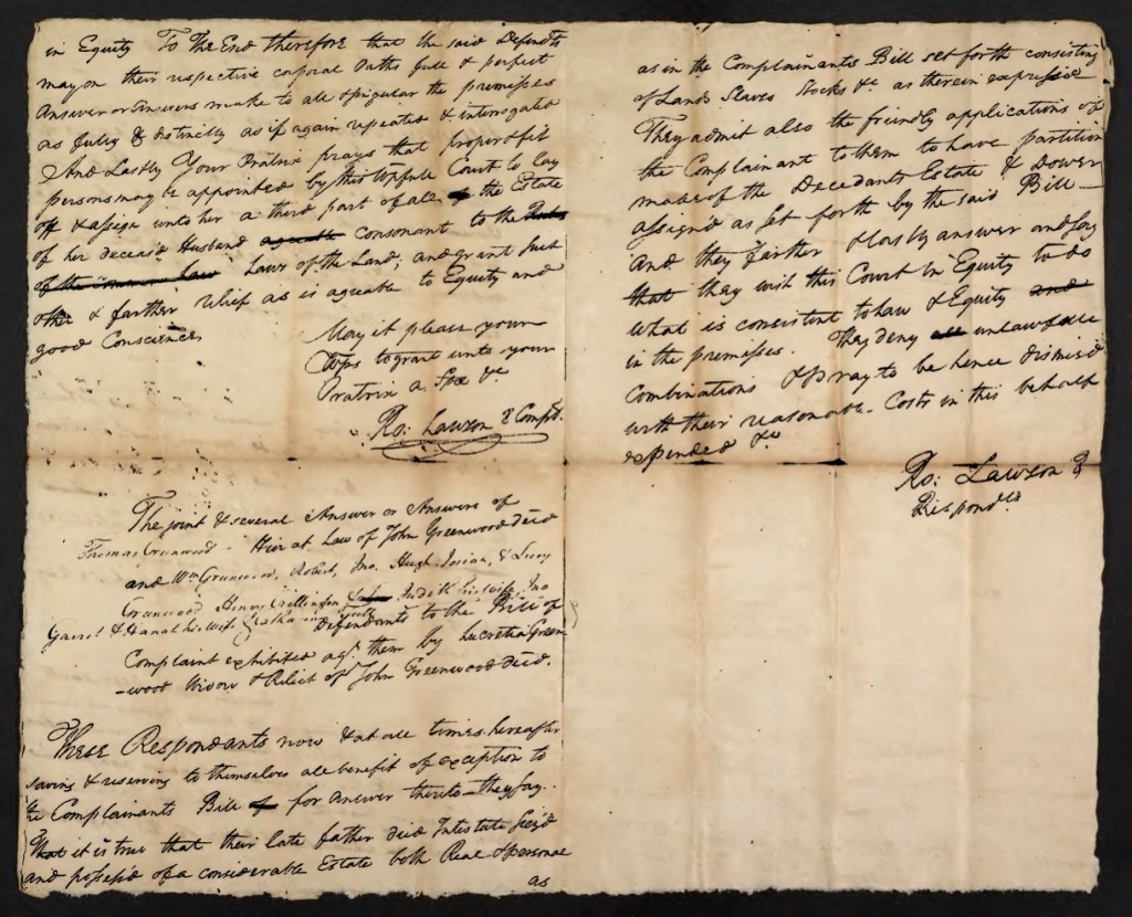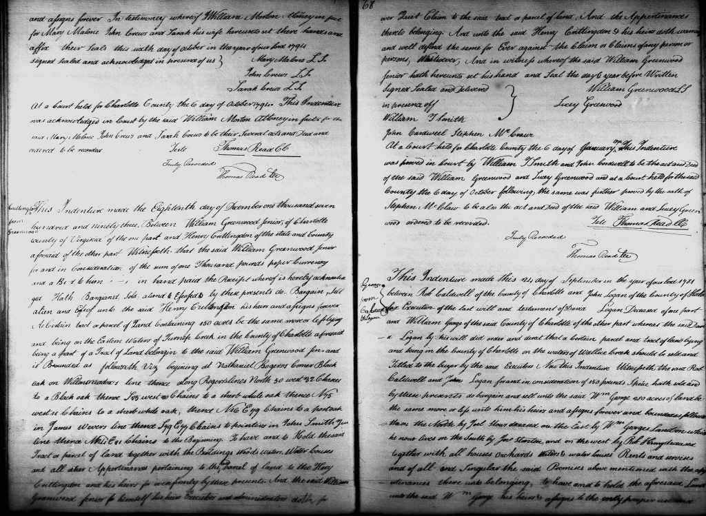 I have not found deed records in Charlotte County showing John Greenwood buying or selling property there. His widow Lucretia’s chancery court complaint bill states that her “late Husband was in his life time ∫eized and po∫se∫sed considerable Real & personal Estate consisting of Lands[,] Slaves[,] Stocks of different kinds & other Estate.”