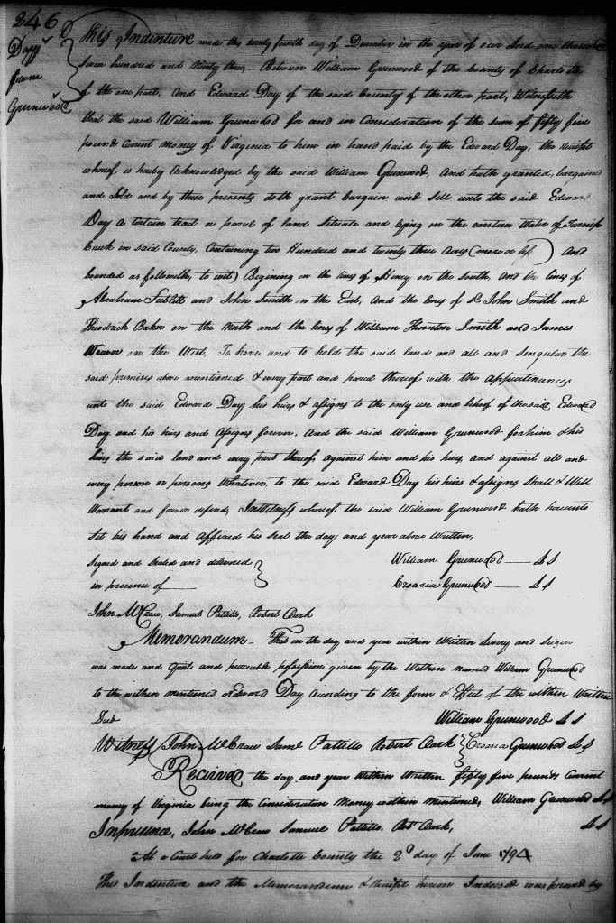 William Greenwood Sr.’s disappearance from the Charlotte County tax list in 1794 and his and wife Lucretia’s sale of their land in 1793 suggests to us that the couple moved to Kentucky in 1794. On 4 December 1793, William Greenwood sold to Edward Day, both of Charlotte County, for £55 pounds 223 acres on Turnip Creek.[23] William and wife Creasia Greenwood both signed the deed, with witnesses John McCraw, Samuel Pattillo, and Robert Cark. William received payment from Day on the same day and signed receipt with these witnesses, and on 2 June 1794 at court, John McCraw proved the deed, with Robert Cark then proving it on 7 September 1795 and William Hughs making oath on 6 February 1797 that he saw William Greenwood sign the deed.