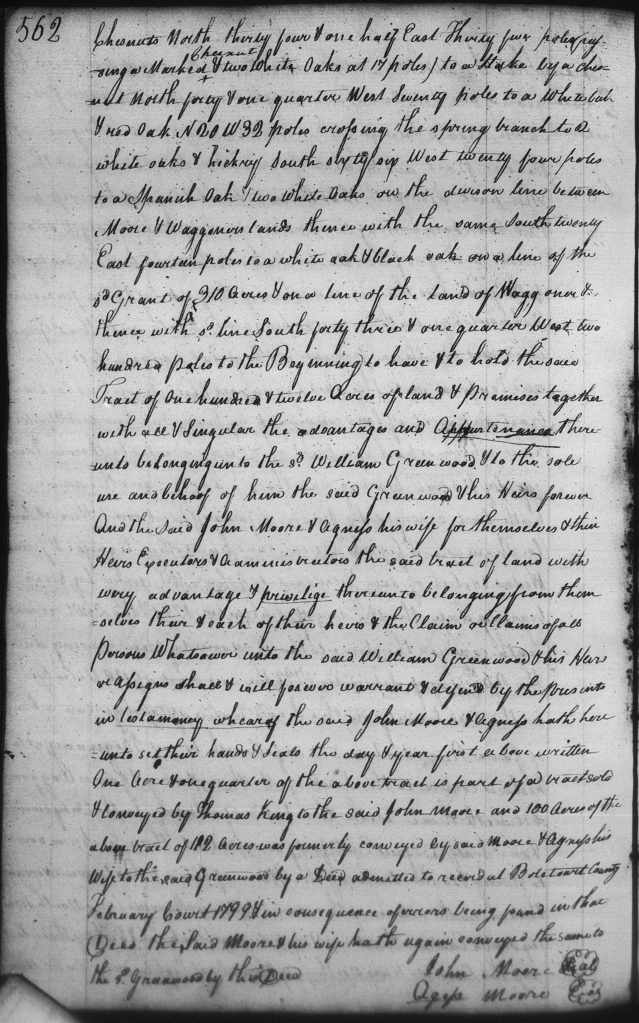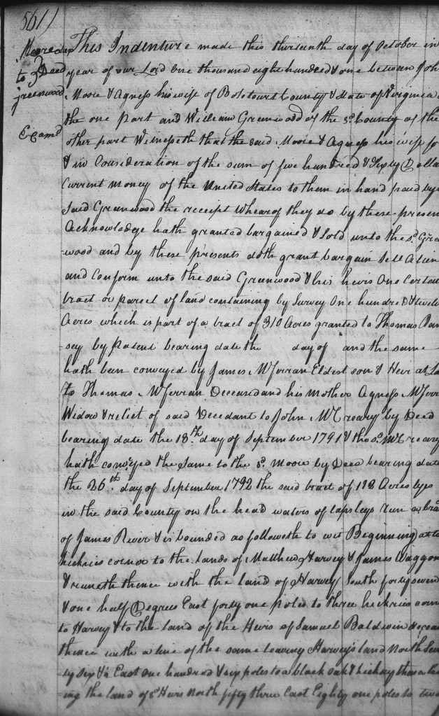 On 4 January 1799, William Greenwood purchased from John Moore, both of Botetourt County, for £150 100 acres on the headwaters of Lapsley’s Run of James River in Botetourt.[6] John Moore and his wife Agnes Moore both signed, Agnes making her mark. The Moores acknowledged the sale at Botetourt court in February 1799. This land purchase tells us, I’m pretty sure, that William Greenwood and Ruth Brooks had married by this date or were planning to marry very soon. On 13 October 1801, John and Agnes Moore sold William Greenwood another piece of land, 112 acres, in Botetourt, with the deed noting that all parties were from of that county and that William paid $560 for the land.[7]