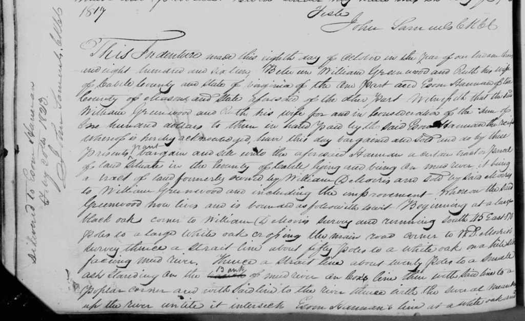 On 25 September 1824, William and Ruth Greenwood sold to John Turley, all parties living in Cabell County, for $300 a tract of 100 acres on Mud River.[18] The deed states that the Greenwoods had bought the land from Daniel Huddleston. William and Ruth both signed and Ruth relinquished dower on 4 October 1824, an indication that the couple were selling their homeplace in preparation for their move to Sangamon County, Illinois. According to Power’s History of the Early Settlers of Sangamon County, Illinois, the Greenwood family arrived in Sangamon County, Illinois, in October 1824, settling in Curran township.[19] Turley was another early settler on Mud River near Ona, according to Burdette.[20]
