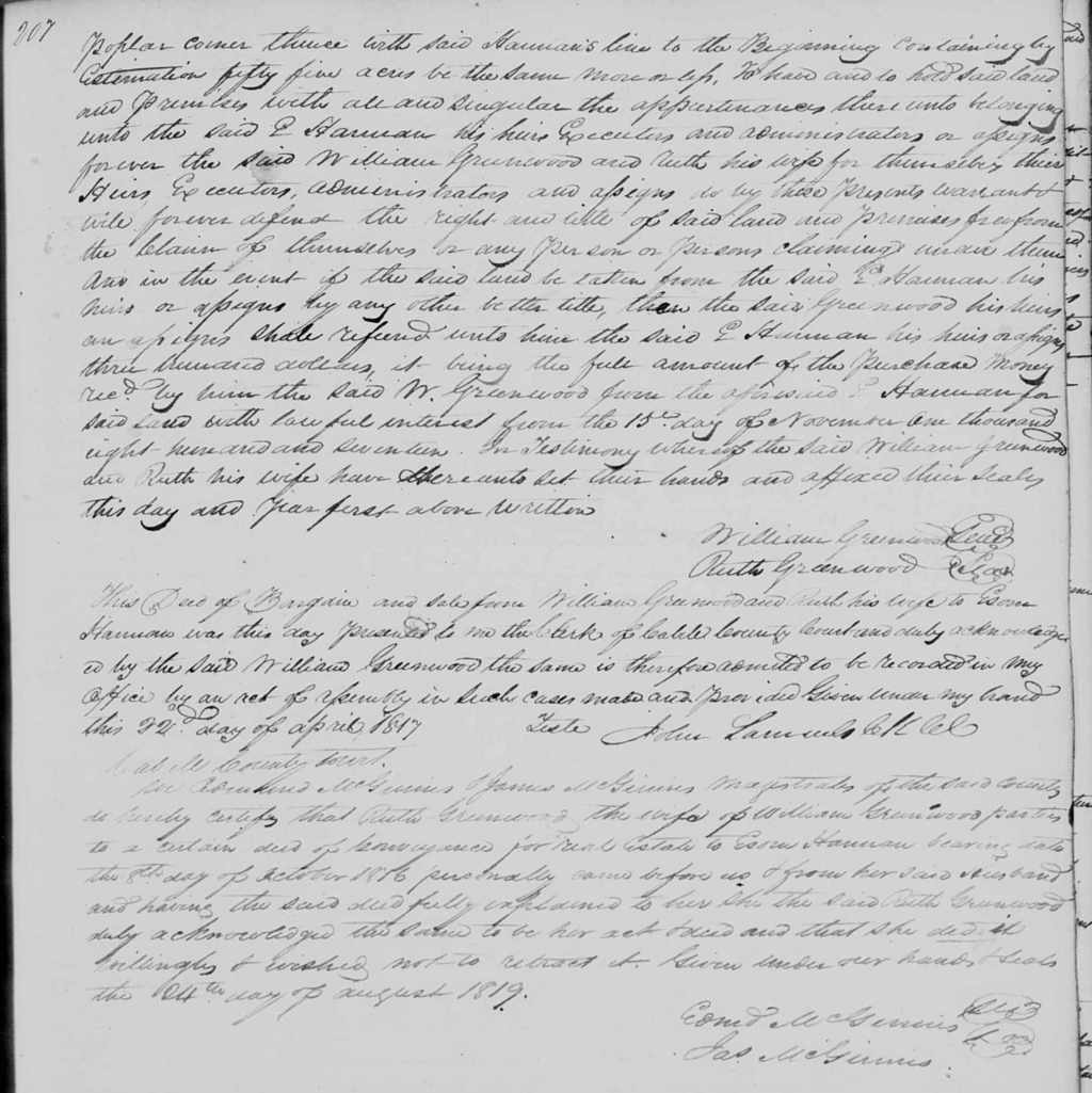 On 8 October 1816, William and Ruth Greenwood sold to Esom Hannan, all of Cabell County, the land they had bought from William D. Morris in 1814.[15] The deed states initially that the selling price was $100, and then as it concludes that the full amount was $300. William and Ruth both signed with no witnesses. On 22 April 1817, the couple acknowledged the deed and it was recorded. Burdette’s history of Ona cited above states that Esom Hannan was another of the early settlers on Mud River near Ona Station.[16]