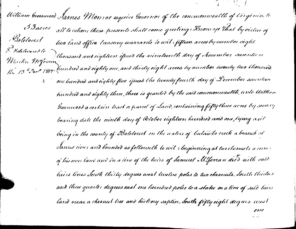 William Greenwood (Jr.) in Botetourt County, Virginia, Records