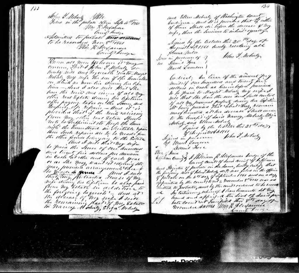 Uncle John Moberly came from there to Lawrence county, Indiana and there married Margaret Brooks. In the early settling of Iowa, they moved to Fairfield, Iowa and ever lived in peace until his death in 1861 or 1868. His widow died in 1884. They had no children.
