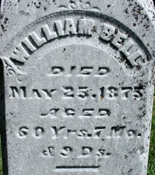 William Bell’s tombstone in Abbott cemetery at Fickle, Clinton County, Indiana, states that he died 25 May 1875, aged 60 years, 7 months, and 9 days, indicating a birthdate of 14 January 1814.[28] His biography in Biographical History of Tippecanoe, White, Jasper, Newton, Benton, Warren and Pulaski Counties, Indiana states that he was born in the Shenandoah Valley of Virginia near Harper’s Ferry.[29]