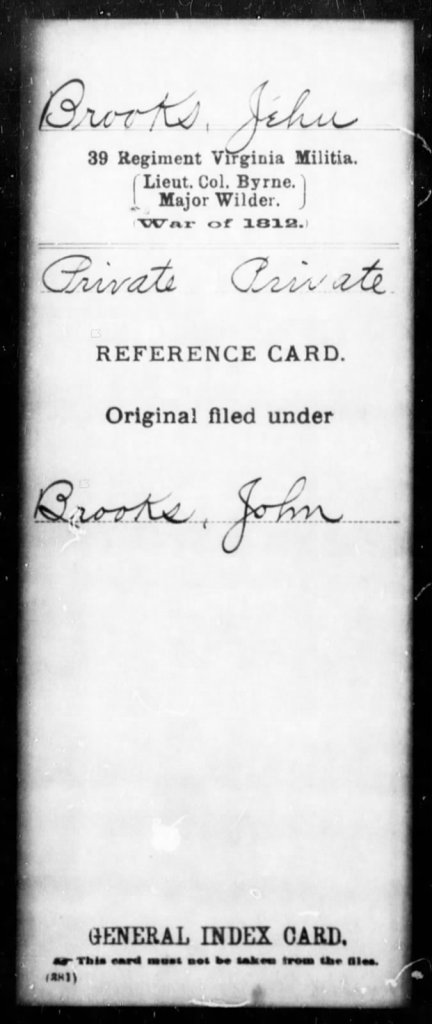 There is a War of 1812 service packet in Virginia for a Jehu Brooks. The index card for his service record states that it was originally filed under the name John Brooks. Whether that means that this man’s name was John Jehu Brooks or that his name, Jehu, had originally been misread as John when the filing system was created, I cannot say. I have not seen this service record, only the index card for it, which shows that Jehu Brooks served in the 39th Regiment of the Virginia Militia under Major Joseph G. Wilder and Lieutenant Colonel James Byrne.[9] Joseph Gwinn Wilder and James Byrne both lived at Petersburg, Virginia, and the men in the unit they commanded in the War of 1812 were drawn for the most part from that vicinity and from southside Virginia. It seems to me very unlikely that the Jehu Brooks of this service record is John Jehu Brooks, son of Thomas Brooks and Margaret Beaumont/Beamon.