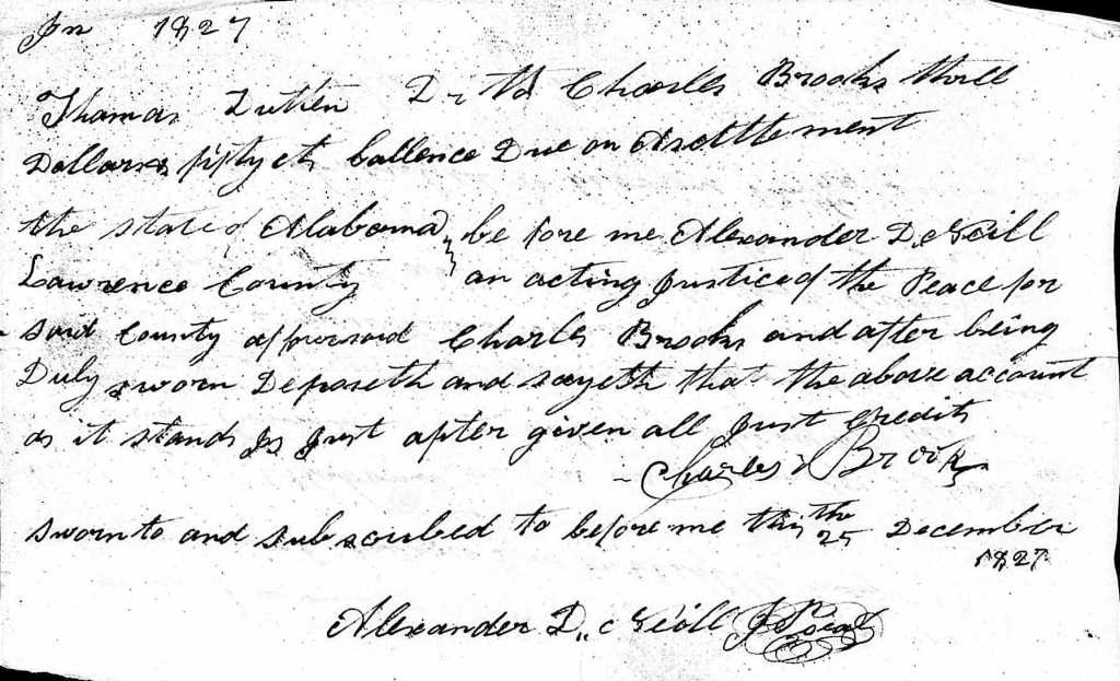 In a May 1837 account for the estate of David Knott of Lawrence County, Alabama, Charles Brooks appears, with a notation that the estate paid him $114.59 in 1836 (Lawrence County, Alabama, Orphans Court Minute Bk. E, p. 194). The same account also shows Charles’s brother-in-law Dennis Lindsey and an unnamed son of Dennis being paid $12.40 with .20 interest in 1836.